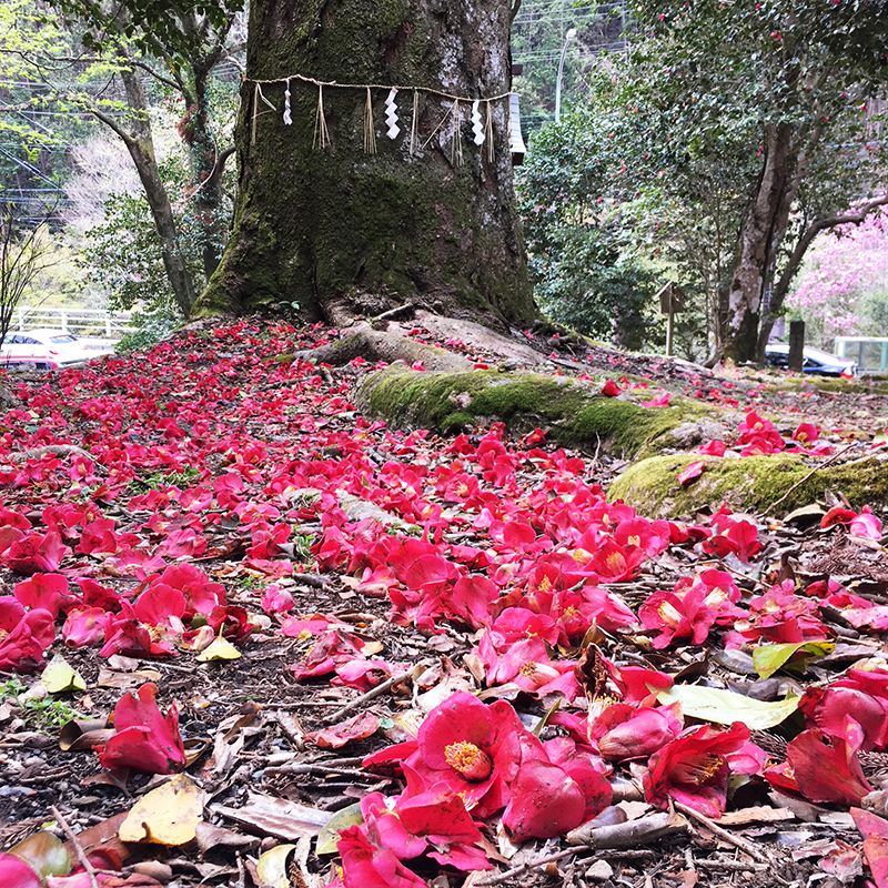 大きなご神木の根元に たくさんの椿