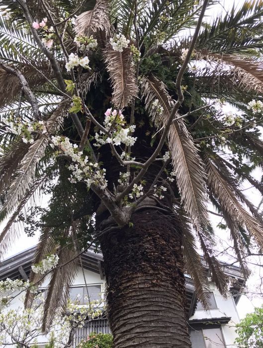 椰子の木の途中から生えて咲いた桜