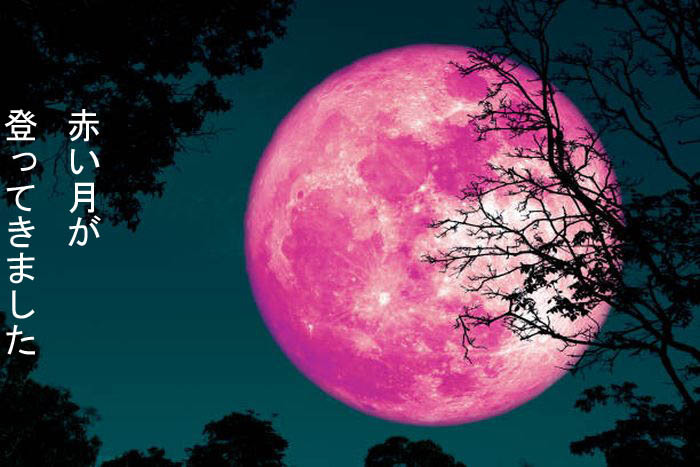 春に咲くピンク色の花が影響しています。実際には月がピンク色になるわけではありませんが、
