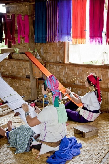 写真は糸つむぎの作業中のカレン族の女性たちです